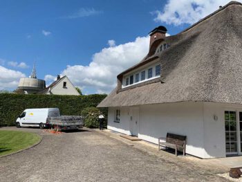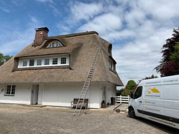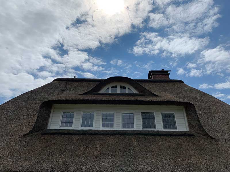 Die Dachstärke wurde hier etwa um 15 cm erhöht, was dieses schöne Reetdachhaus, für die nächsten 8-10 Jahre vor Wind und Regen schützt.