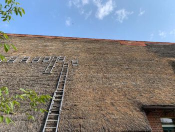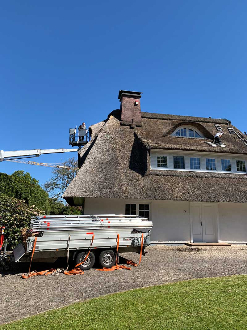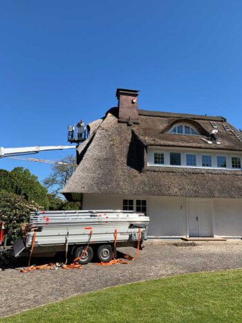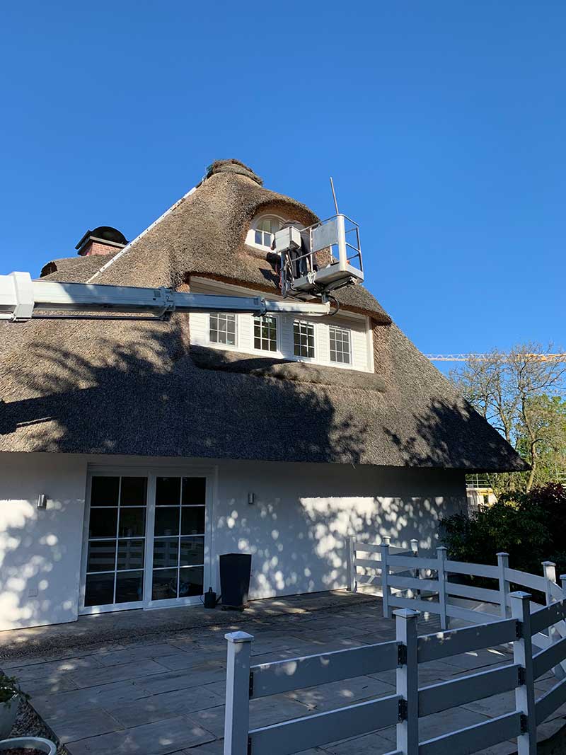 Bei schwer zugänglichen Bereichen des Reetdaches z.B. Am Walm, an denen unsere Leitern nicht ausreichend wären, haben wir von einer Arbeitsbühne gebraucht gemacht. Oft ist der Einsatz solcher Bühnen bei Baustellen wo der Platz ausreichend ist von großen Vorteil, da man sich viel Zeit sparen kann.