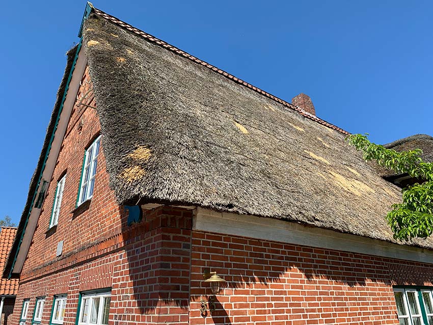 Oft lohnt sich auch eine Reparatur, es muss nicht im jeden Fall das ganze Reetdach erneuert werden durch auffüllen mit neuem Reet können selbst Dächer an dehnen der Schachtdraht hervor scheint wider gut instand gesetzt werden.