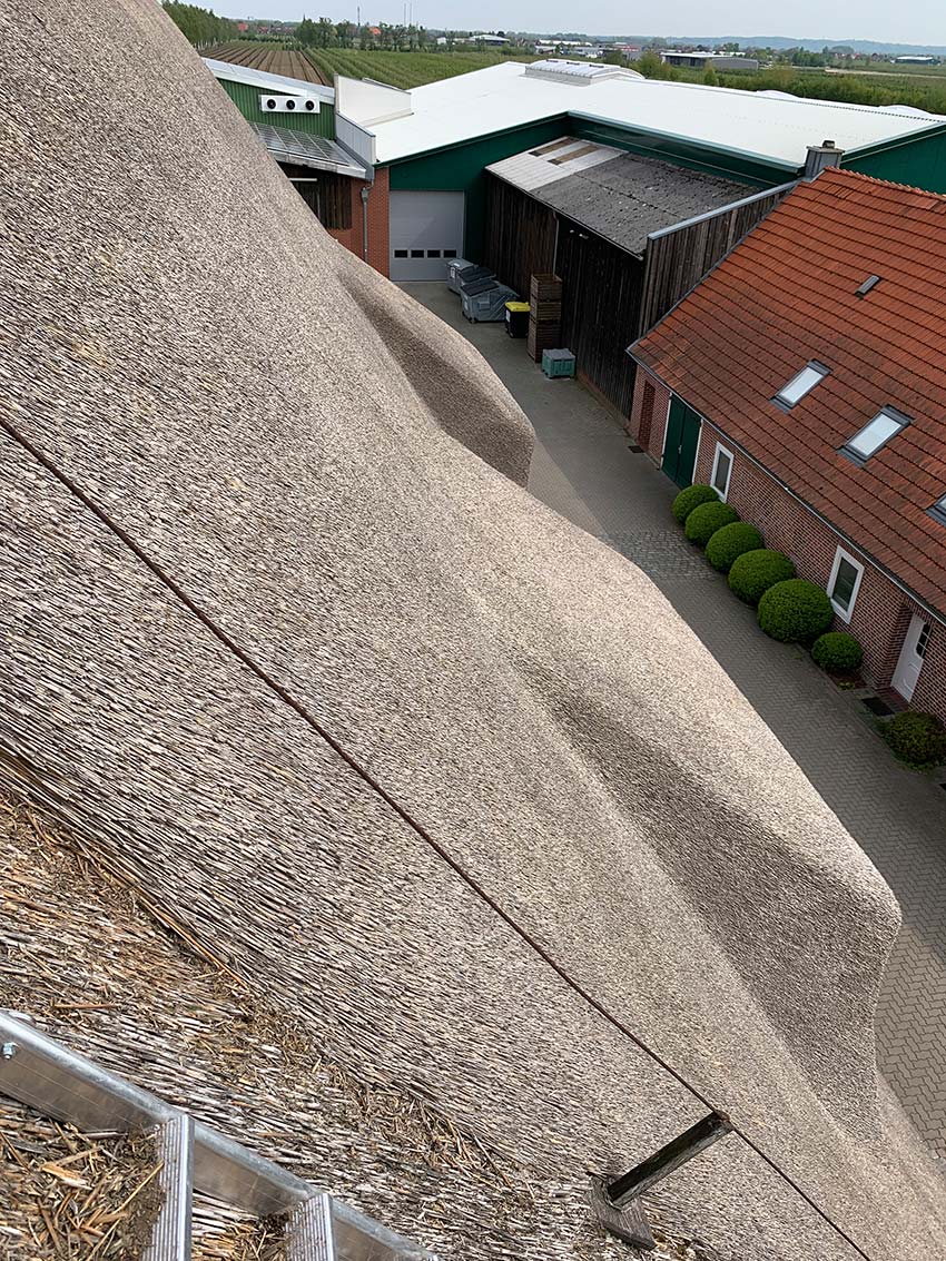 Bei der neu aufbereiteten Dachseite haben wir das Reet, Reit oder auch Rohr genannt, zurückgezogen und etwa 375 Bund neues Reet, mit in diese Fläche eingearbeitet, hierbei konnten wir ein sehr gutes Ergebnis erzielen.